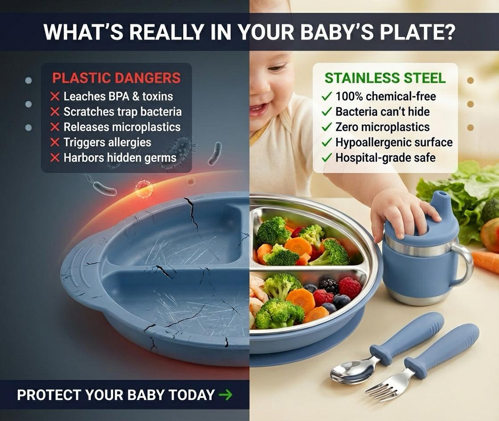 Many plastic feeding sets contain harmful chemicals like BPA,phthalates, or PVC, which leach directly into food, especially when heated.